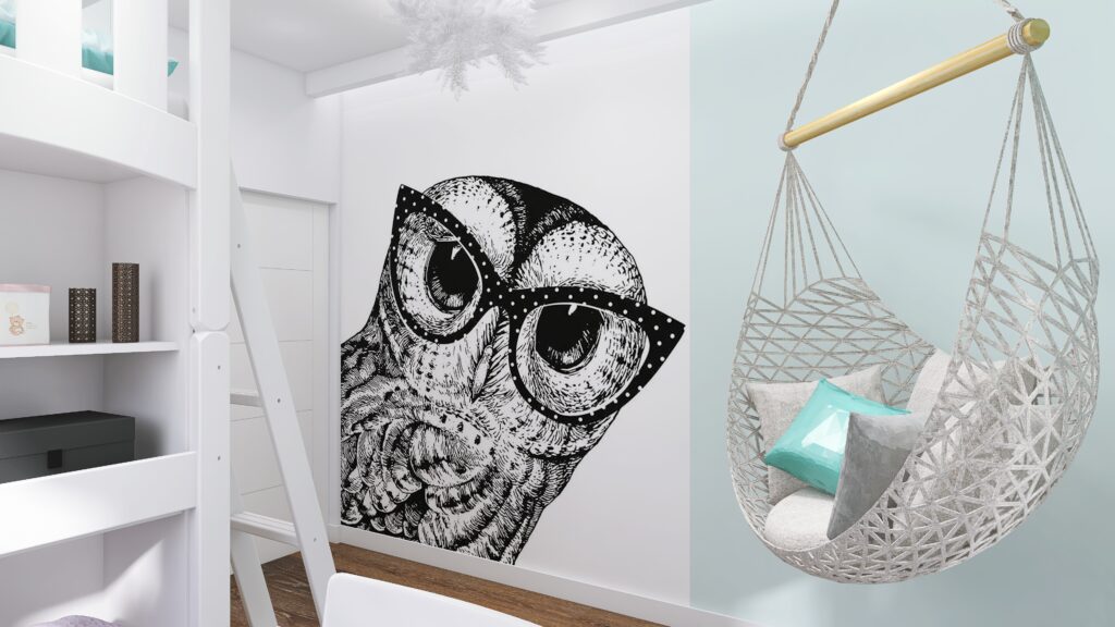 W pokoju po lewej stronie znajduje się szafa z białymi frontami i okrągłymi uchwytami, oraz otwartą przestrzenią przeznaczoną na kosze na zabawki. Obok znajduje się otwarta zabudowa, z kolorowymi półkami (biel, szarości, zieleń eukaliptusowa) na książki, akcesoria i ulubione zabawki. W dalszej części pokoju znajduje się łóżko, a zagłowie zostało wykonane z paneli tapicerowanych w odcieniach szarości,…