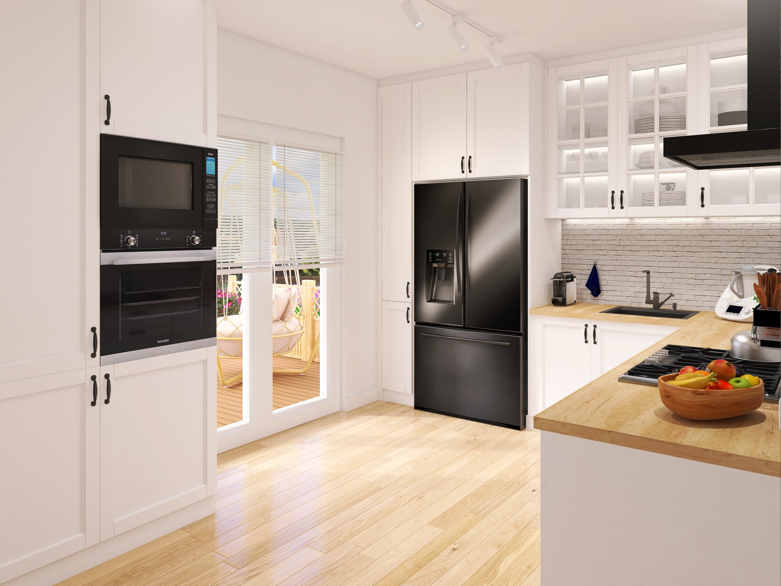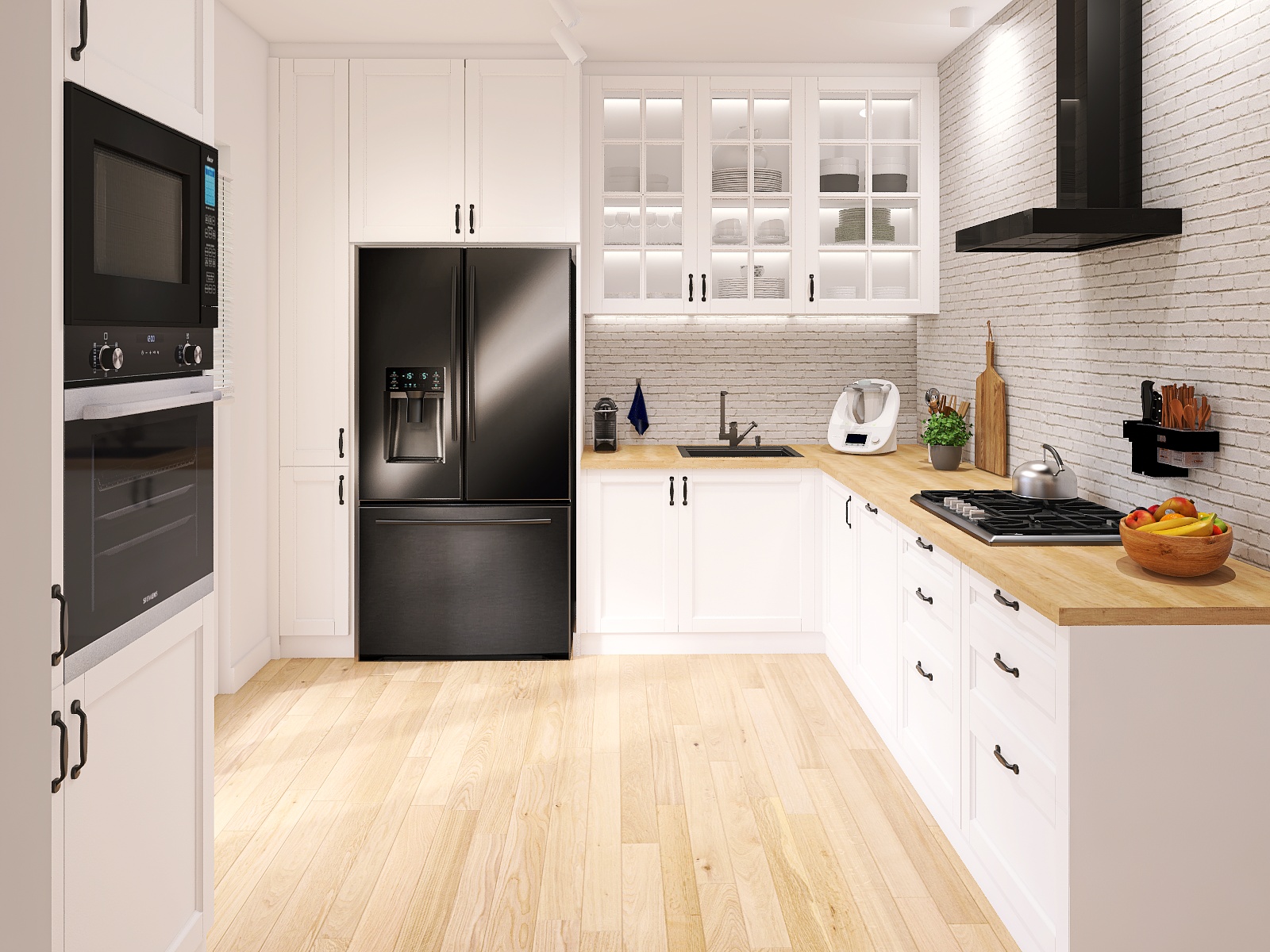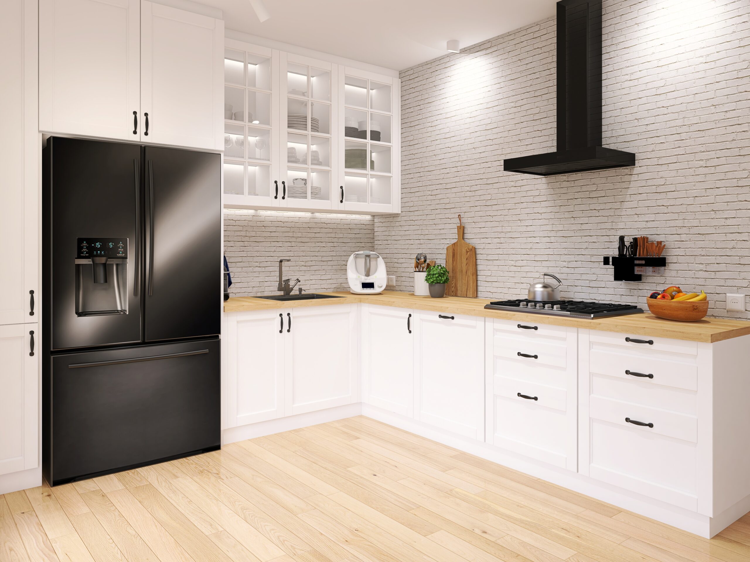 Czarne sprzęty AGD, takie jak lodówka, kuchenka, piekarnik, mikrofala czy okap, stanowią kontrastujący element w tej jasnej kuchni. Ich minimalistyczny design dodają nowoczesności i elegancji. Czarne sprzęty AGD doskonale komponują się z białą cegłą i drewnopodobnym blatem, tworząc spójną całość.