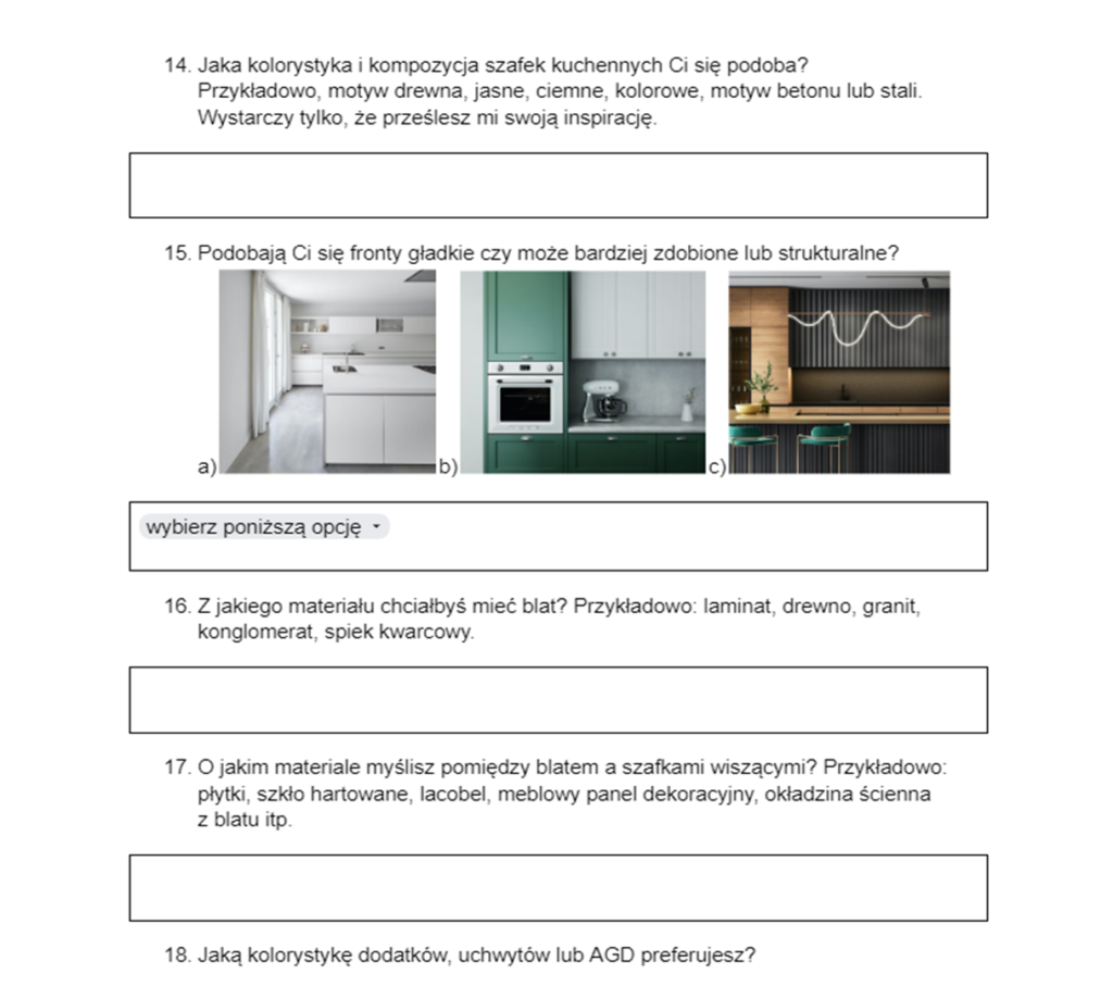 Ankieta ta jest ważnym elementem w procesie projektowania i pozwala na dokładne określenie Twoich wymagań i zaprojektowaniu wnętrza idealnie dopasowanego do Twoich potrzeb. Dzięki temu  wykorzystuje cały potencjał Twojego wnętrza.