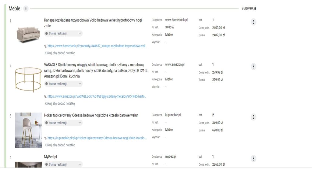Lista zakupów proponowanych materiałów i wyposażenia, które wypełniają Twoje wnętrze wraz z linkami, abyś bez wychodzenia z domu mógł je zakupić, a większość z nich kurier przywiezie je bezpośrednio do Ciebie. Dzięki temu zyskujesz czas na spędzenie go z bliskim i ulubiony sposób.