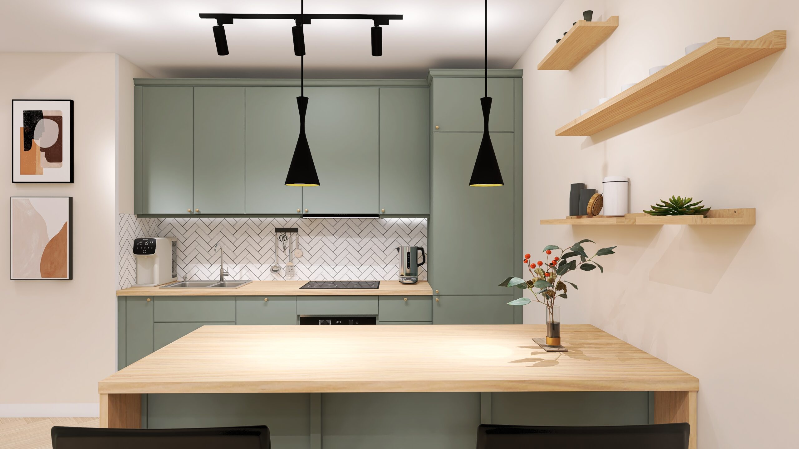 Kuchnia o dwurzędowym układzie to bardzo praktyczne rozwiązanie. Przy ścianie jest zabudowa meblowa a naprzeciw wyspa, która służy jako blat roboczy i miejsce do spożywania posiłków. Kolorystyka kuchni jest w szarozielonej barwie, dzięki czemu swoim odcieniem nadaje lekkości i świeżości. Blat imitujący drewno, nadaje naturalności i sprawia, że wnętrze staje się ciepłe i przytulne. Mozaika w tzw. fartuchu w białym kolorze ułożona w jodełkę rozjaśnia i nadaje głębi pomieszczeniu. Wejściowa lewa ściana od holu została poszerzona o 5 cm, tak aby blat kuchenny nie wystawał na korytarz. Cała przestrzeń została idealnie zagospodarowana, szafki są otwierane na zawiasach oraz funkcjonalne i wygodne szuflady. Znajdziemy tu dużo miejsca do przechowywania i wyspę, na której mamy blat roboczy, aby swobodnie przyrządzać ulubione potrawy. Wysoka lodówka w zabudowie meblowej sprawia, że wtapia się w całe wnętrze. Przy wyspie znajdują się czarne krzesła, a nad nią wiszą czarne lampy, które oświetlają przestrzeń. Na ścianie zawieszone drewniane półeczki dają kolejną przestrzeń na przechowywanie np. ulubionych filiżanek czy ziół, dzięki którym będzie przyjemnie pachnieć w całym pomieszczeniu. Kuchnia jest wygodna, praktyczna i funkcjonalna a zastosowane proste formy i barwy nadają naturalności i lekkości całej przestrzeni.