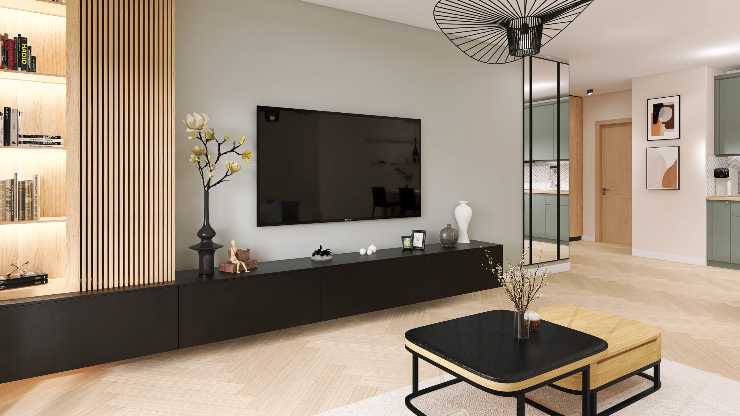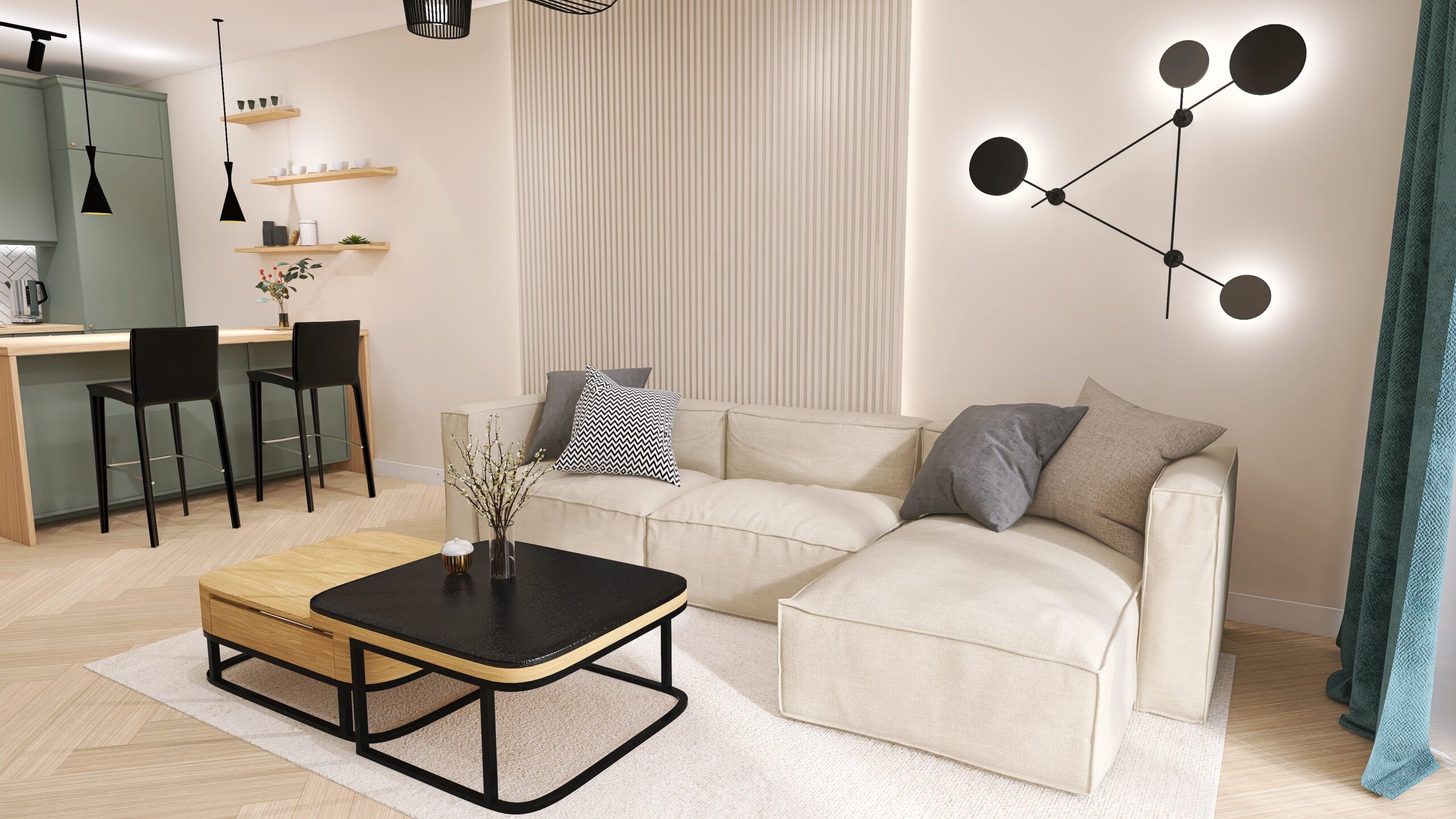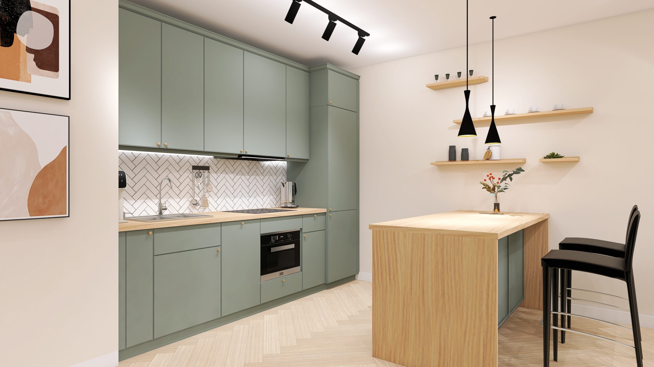 Salon z aneksem kuchennym w odcieniach beżu i zgaszonej zieleni to eleganckie i nowoczesne połączenie kolorów i materiałów. Beżowe ściany, tworzą ciepły i przytulny klimat w całym wnętrzu. Subtelny akcent podkreśla ściana z TV w kolorze z gaszonej zieleni, nadając naturalności i głębi. Podłoga w odcieniach naturalnego drewna, ułożona jest w jodełkę, wzór ten powtarza się na ścianie w kuchni, tworząc spójność w całym wnętrzu.