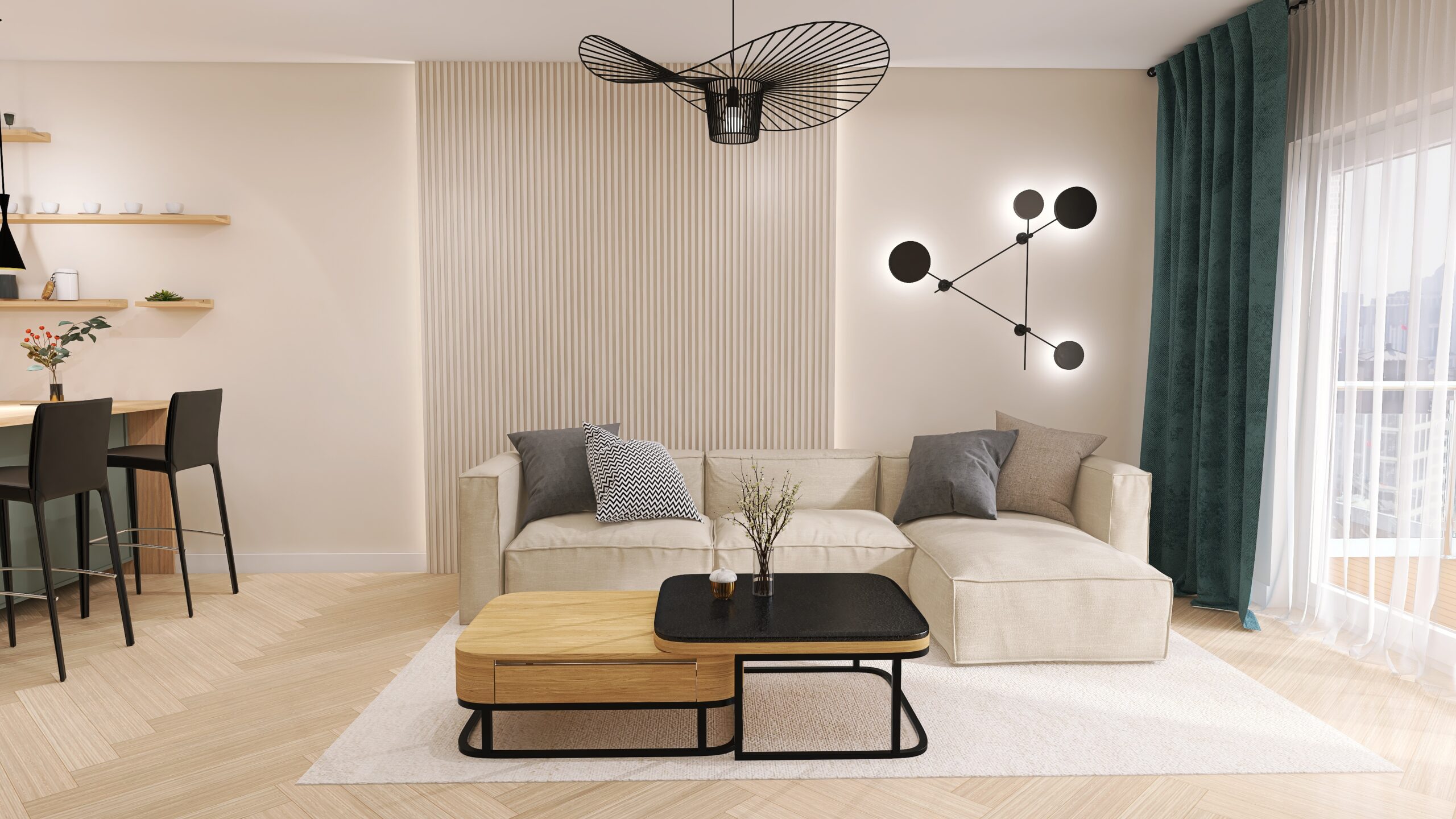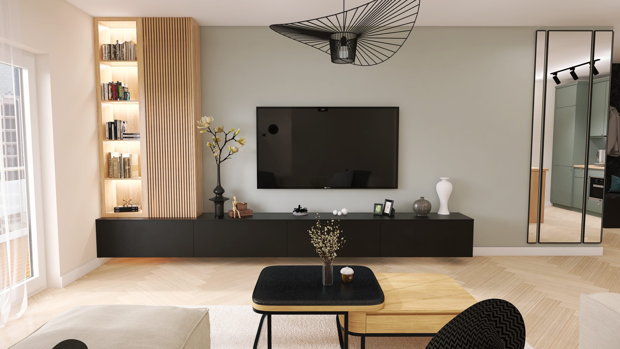 Wygodny narożnik w odcieniach beżu zaprasza na długie rozmowy i seanse filmowe. Panele dekoracyjne we wzór lameli, podświetlone podkreślają ich charakter, jednocześnie służąc jako dodatkowe oświetlenie nadające klimat w całym wnętrzu. Na suficie czarna lampa w kształcie kapelusza nadaje lekkości i podkreśla charakter. Na ścianie z TV przeważa kolor zgaszonej zieleni, podkreślając zabudowę meblową w kolorze drewna. Konsola w kolorze czarnym jeszcze bardziej podkreśla charakter wnętrza. Lustra w czarnej ramie idealnie dopełniają przestrzeń, nadając jej głębi. Całe pomieszczenie jest spójne, harmonijne a przede wszystkim funkcjonalne